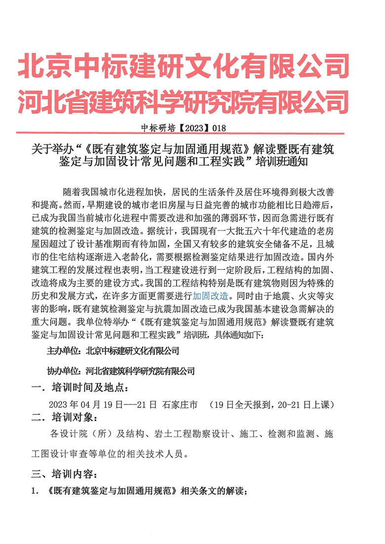 關(guān)于舉辦“《既有建筑鑒定與加固通用規(guī)范》解讀暨既有建筑鑒定與加固設(shè)計(jì)常見問題和工程實(shí)踐”培訓(xùn)班的通知