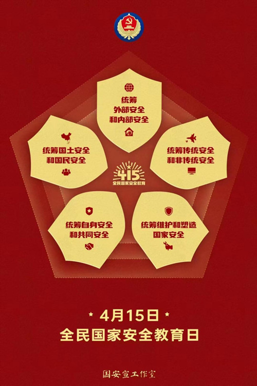 2023年4月15日是第八個全民國家安全教育日?;顒又黝}為:“貫徹總體國家安全觀,增強全民國家安全意識和素養(yǎng),夯實以新安全格局保障新發(fā)展格局的社會基礎(chǔ)?!?/span>